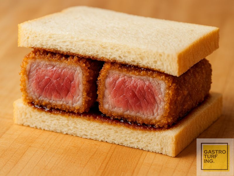 A thick Wagyu steak is seasoned, dusted in flour, dipped in egg, coated in panko, and fried until golden—crunchy outside, juicy and rosy inside. Then it’s tucked between shokupan slices (often crustless), lightly buttered and sometimes toasted. The result? A two-bite masterclass in texture and umami.